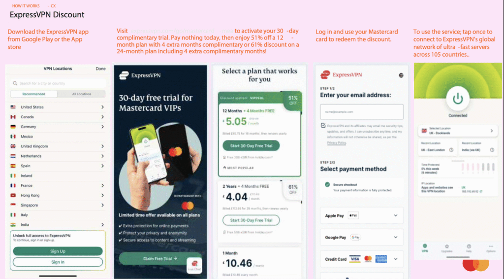 - Visit expressvpn.com/go/mastercard-mea to activate your 30-day complimentary trial. Pay nothing today, then enjoy 51% off a 12-month plan with 4 extra months complimentary or 61% discount on a 24-month plan including 4 extra complimentary months!