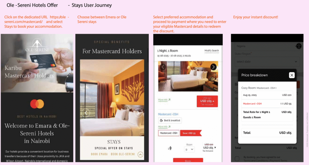 SMS / Short promo Pay with your eligible Mastercard at Ole-Sereni and enjoy discounts and exclusive benefits on stays, dining and spa services.
