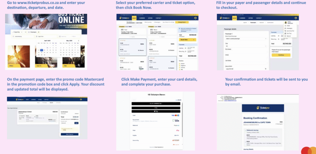 Description Get up to 5% off on your long distance ride with Ticketpro bus! Book your long-trips bus tickets easily at ticketprobus.co.za with Mastercard and enjoy exclusive savings: